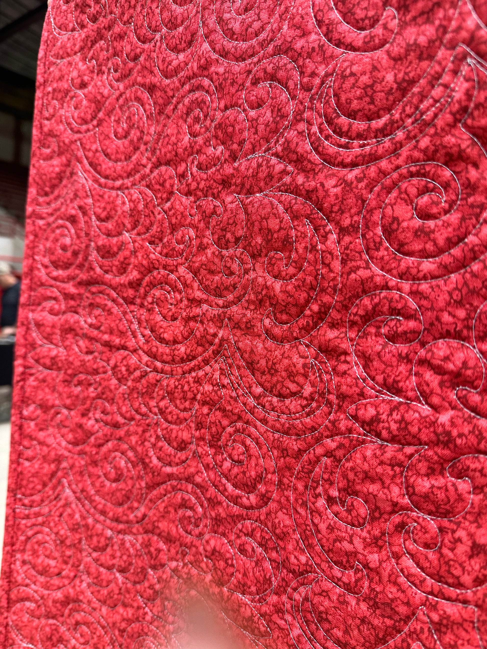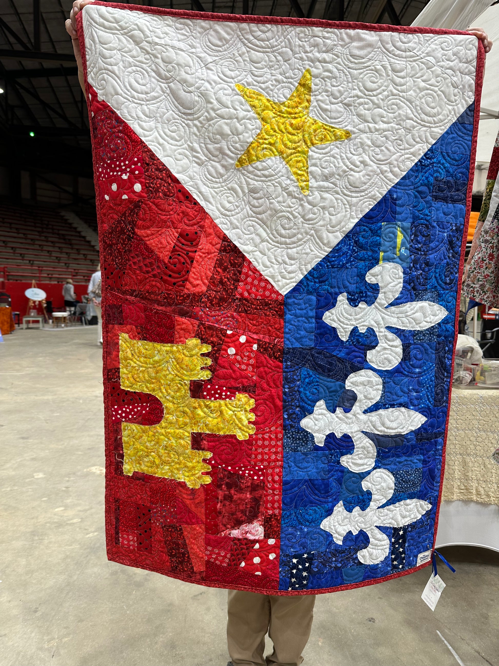 This is a beautiful crumb pieced Acadian Flag Wall Hanging. It measures 43 inches by 30 inches and is quilted with fleur de lis.