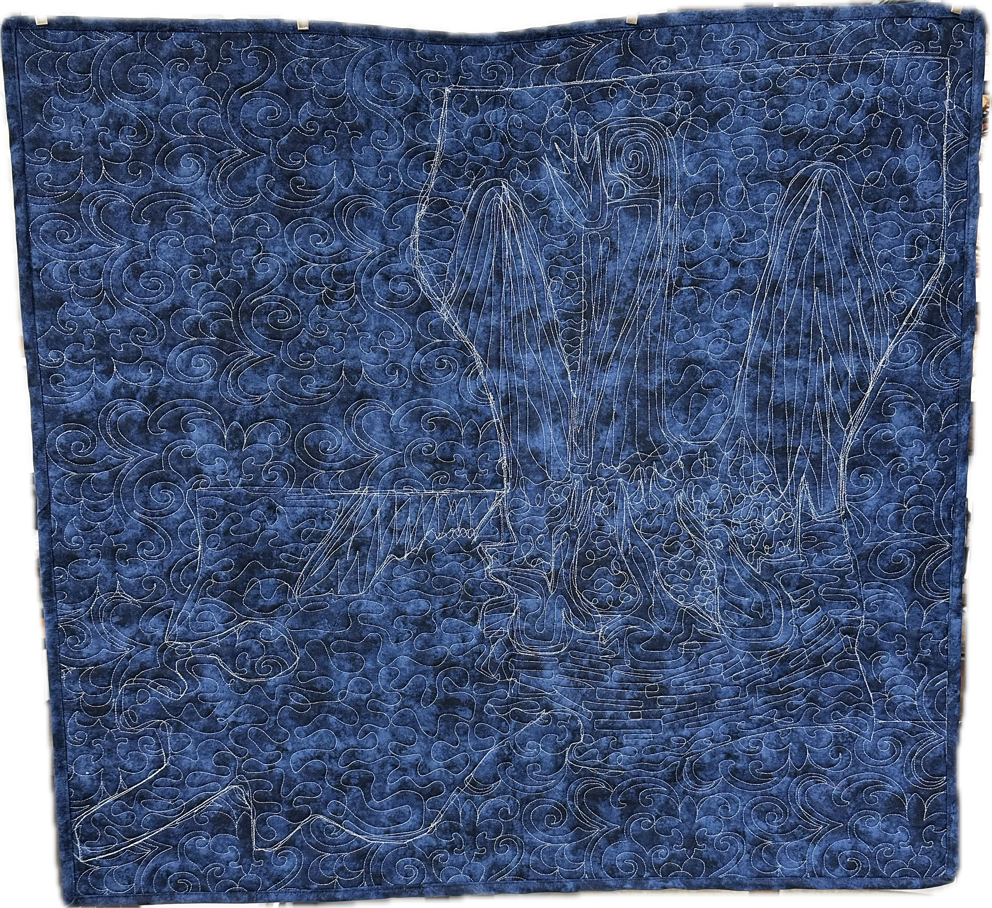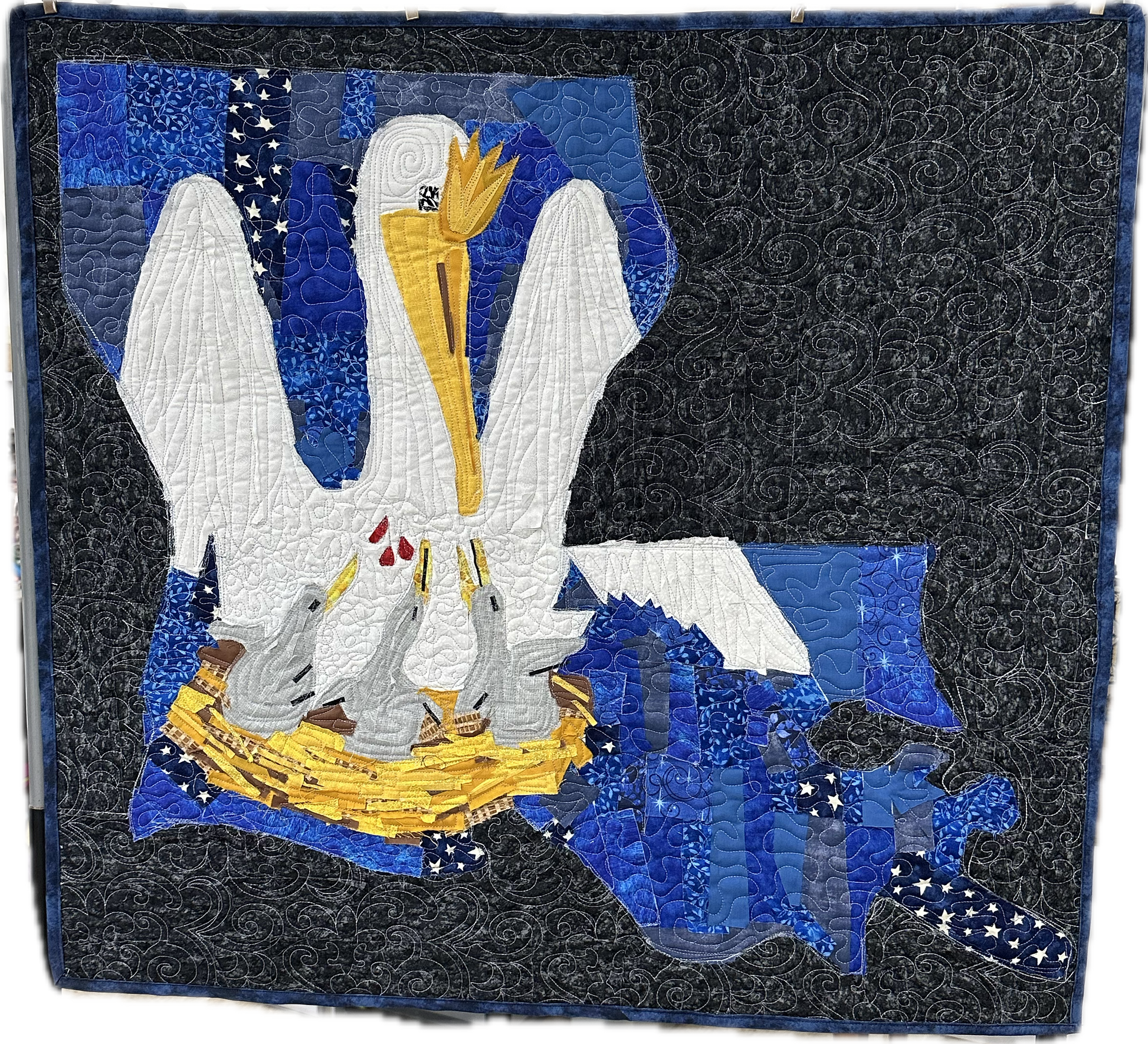 This beautiful wall hanging is a quilted collage of fabrics representing the Louisiana Flag within the shape of Louisiana. It measures 30" x 29".